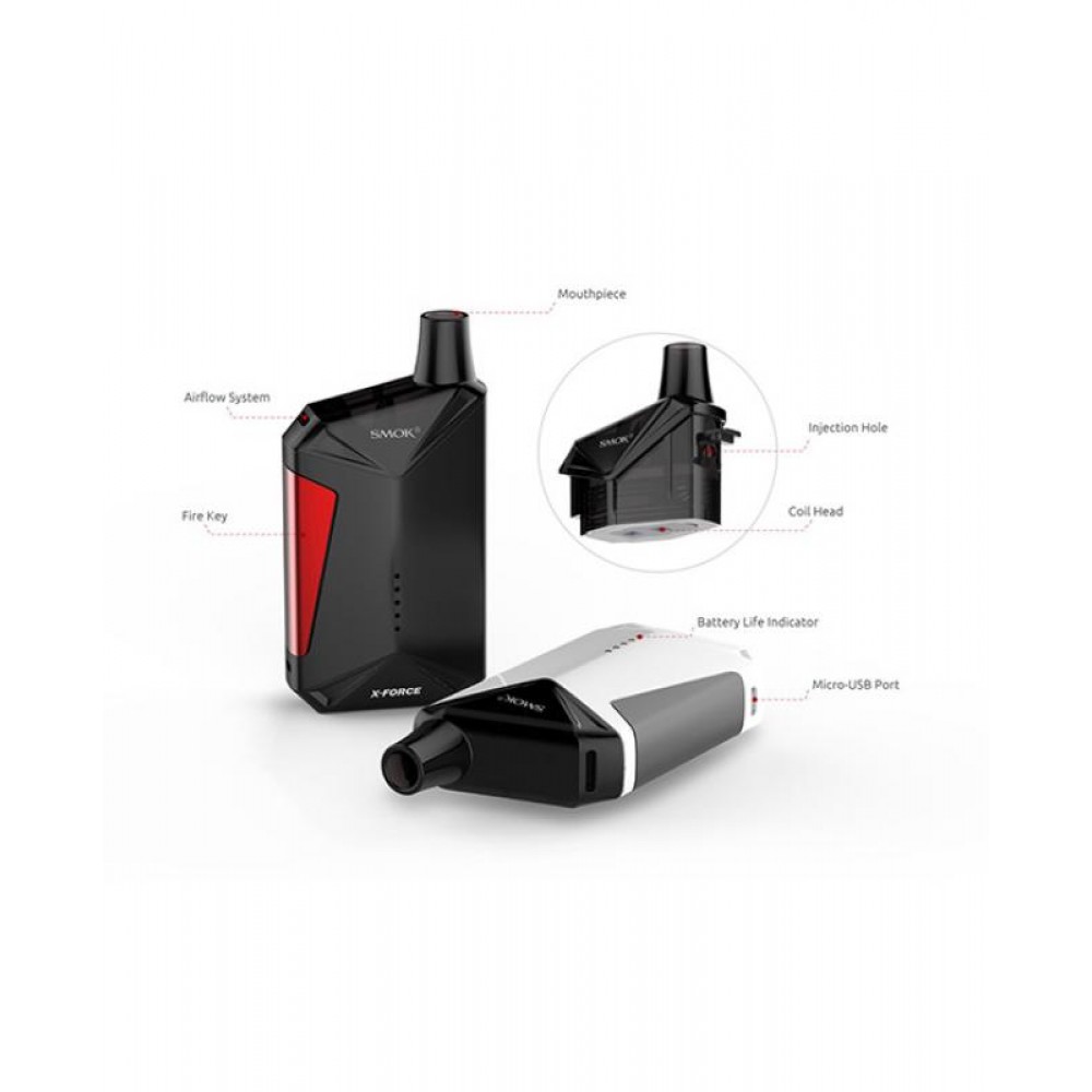 The Smok X-Force pod system Starter Kit, which is the newest one-button activation Vape Starter Kit. the carved patterns on the upper part echo the curved lines at the bottom of the battery, by combing the two you can get the "X" mark, X-Force employs a minimalist design that is indeed the new trend of modern fashion, allowing vapers to feel the purity of vaping. the new Smok X Force built-in 2200mah battery can charge it via micro USB port directly. the vertical arrangement of 5LED indicators can clearly show you the battery life. the X-Force Pod can hold 7ml e-juice, pre-installed X-Force Coils will deliver massive vapor and dense flavor. the vertical airflow system and transverse coil have changed the previous layout structure that air intake and coil layout are in the same direction, and structurally eliminated the problem of oil frying and oil leaking. the airflow direction has been changed from line shape to serpentine shape, which can greatly increase the length of airflow. so that vapers can be fully collected to produce large clouds and dense flavor.